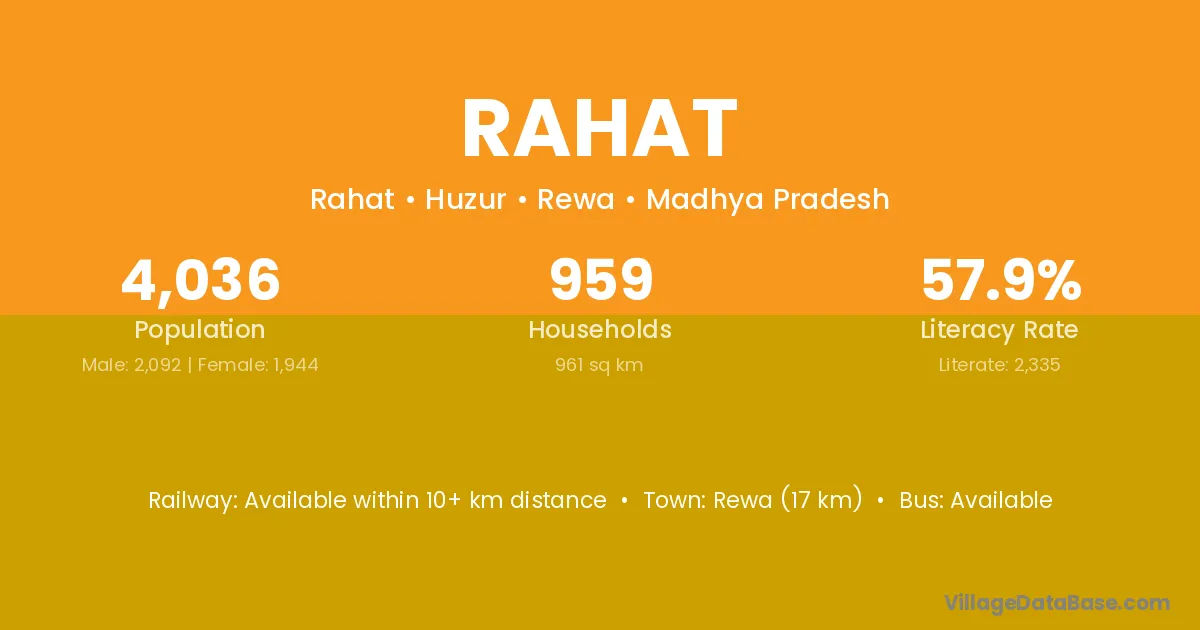 Rewa (17 km) is the nearest town to Rahat village for major economic activities and is located approximately 17 km away.