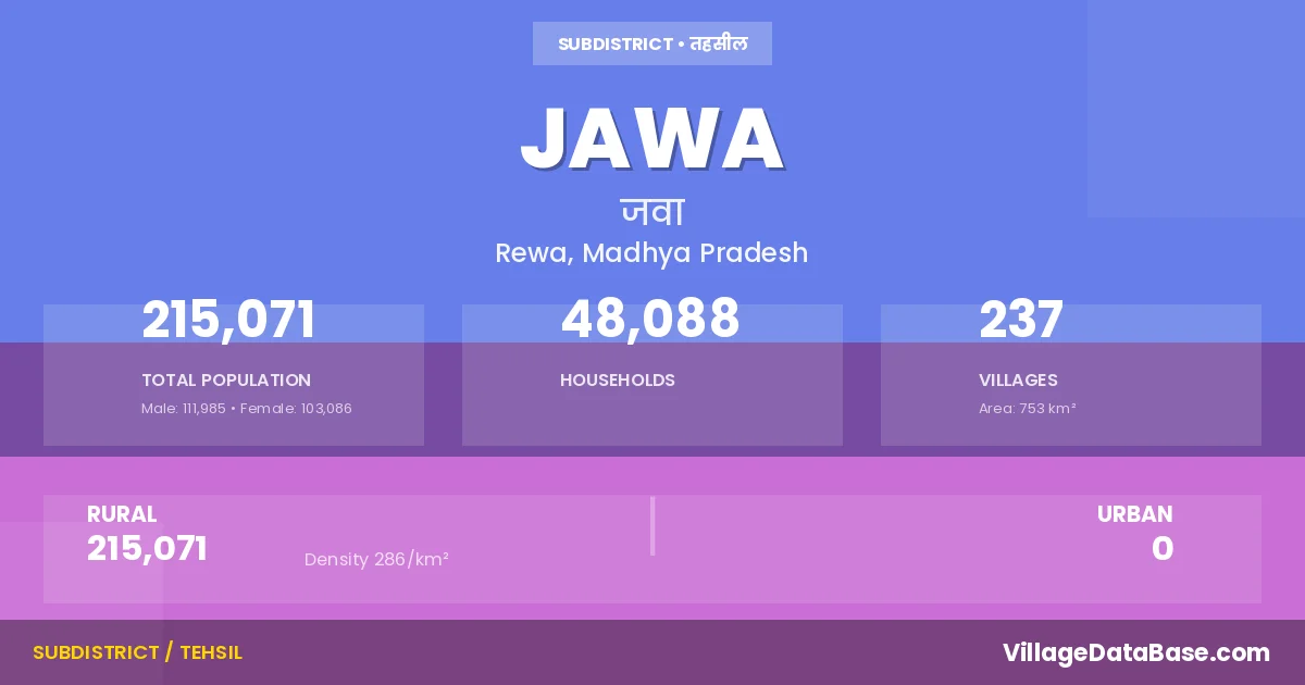 Jawa is a town and Tehsil in the Rewa district of the Madhya Pradesh. In India, a Tehsil is a subdivision of a district responsible for the administration and revenue collection of a specific area within the district. Tehsils play a crucial role in the local governance structure, contributing significantly to the development and administration of their communities.