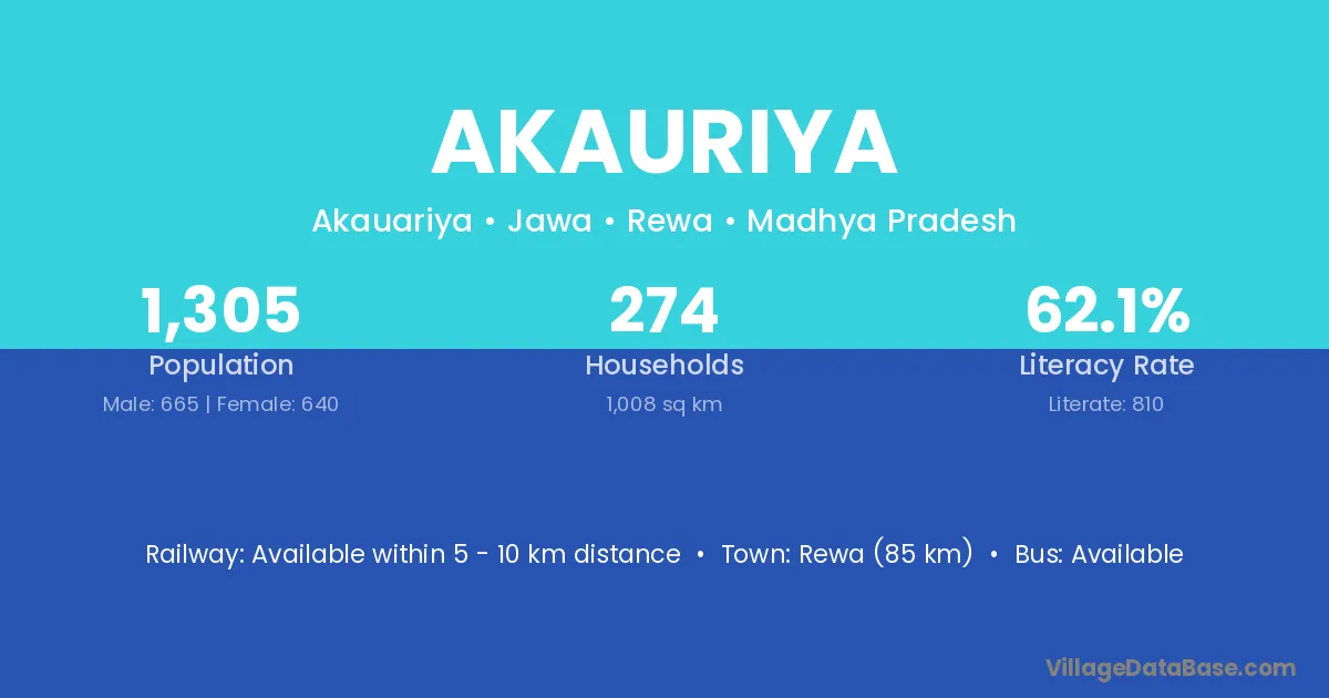 Rewa (85 km) is the nearest town to Akauriya village for major economic activities and is located approximately 85 km away.
