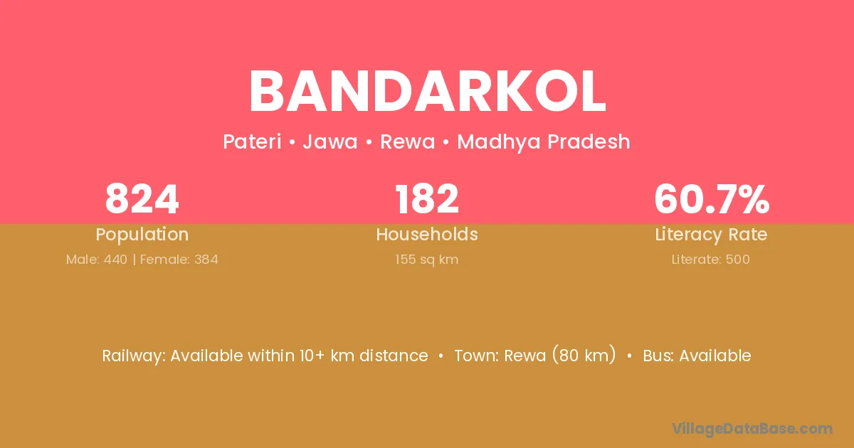 Rewa (80 km) is the nearest town to Bandarkol village for major economic activities and is located approximately 80 km away.