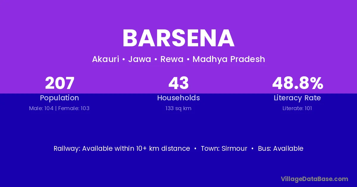 Barsena village has a total population of 207 people, of which 104 are males and 103 are females.