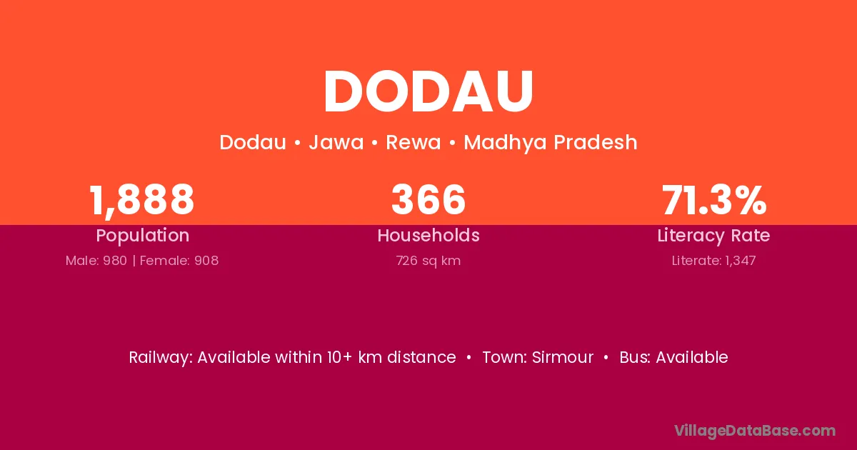 Dodau village has a total population of 1,888 people, of which 980 are males and 908 are females.