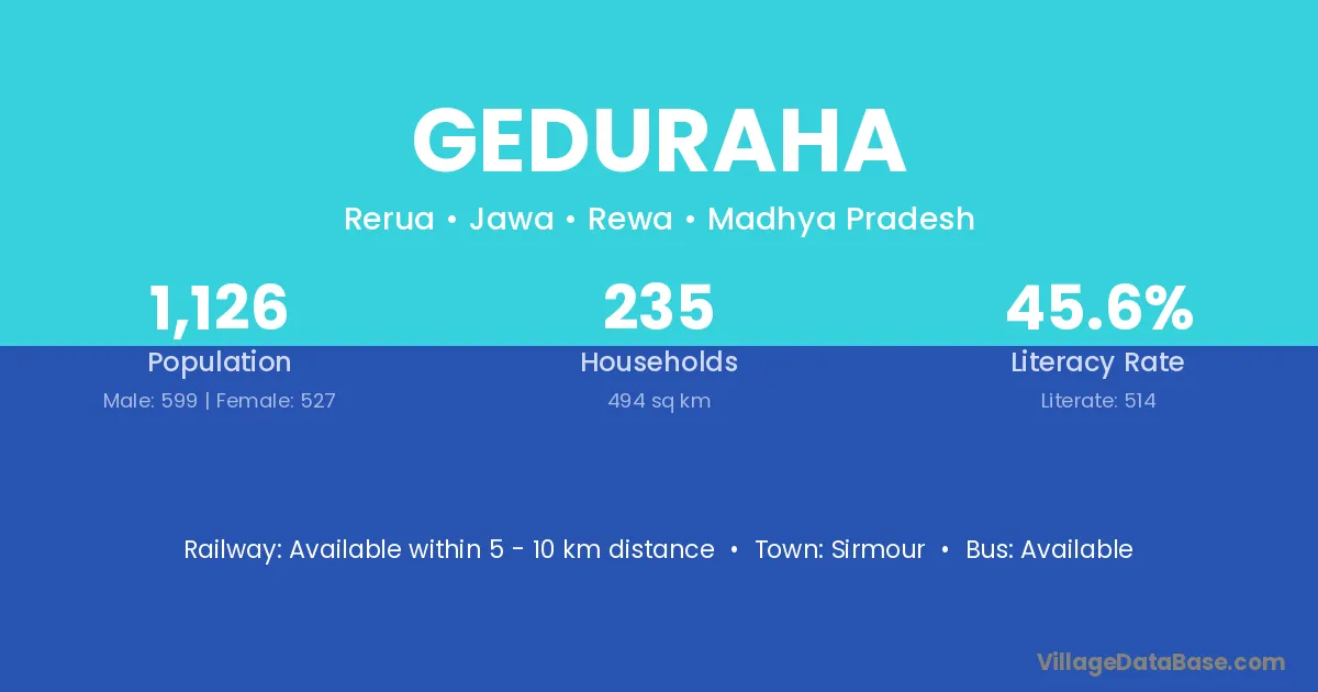 Geduraha village has a total population of 1,126 people, of which 599 are males and 527 are females.