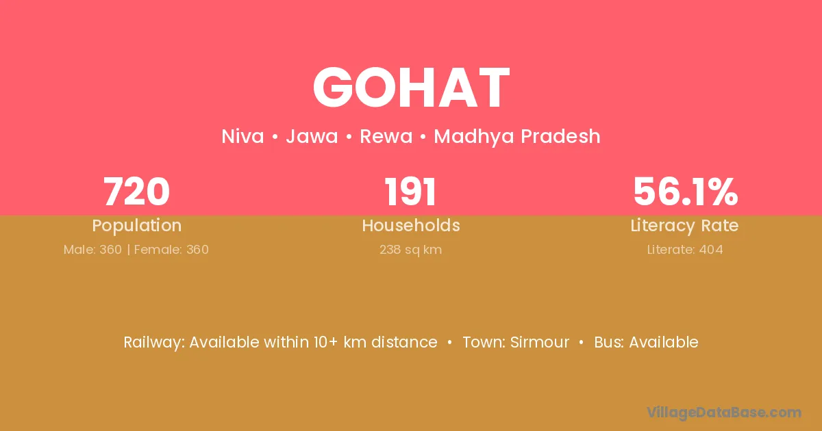 Gohat village has a total population of 720 people, of which 360 are males and 360 are females.