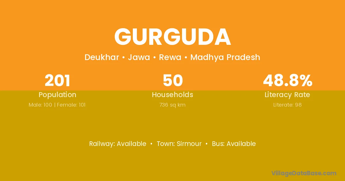 Gurguda village has a total population of 201 people, of which 100 are males and 101 are females.