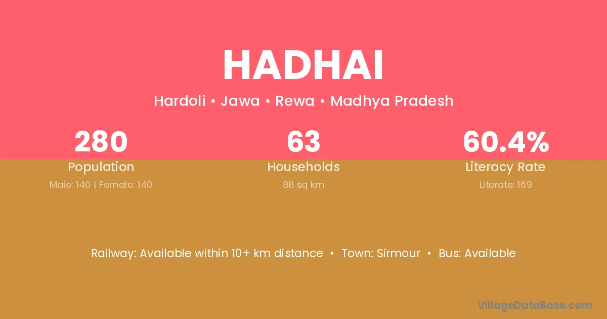 Hadhai village has a total population of 280 people, of which 140 are males and 140 are females.