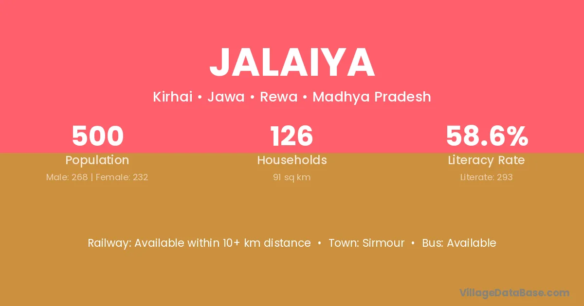 Jalaiya village has a total population of 500 people, of which 268 are males and 232 are females.