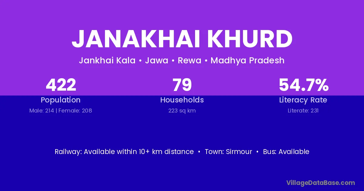 Janakhai Khurd village has a total population of 422 people, of which 214 are males and 208 are females.