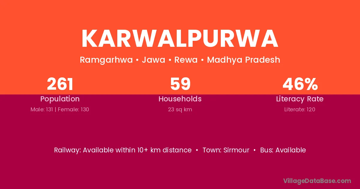 Karwalpurwa village has a total population of 261 people, of which 131 are males and 130 are females.