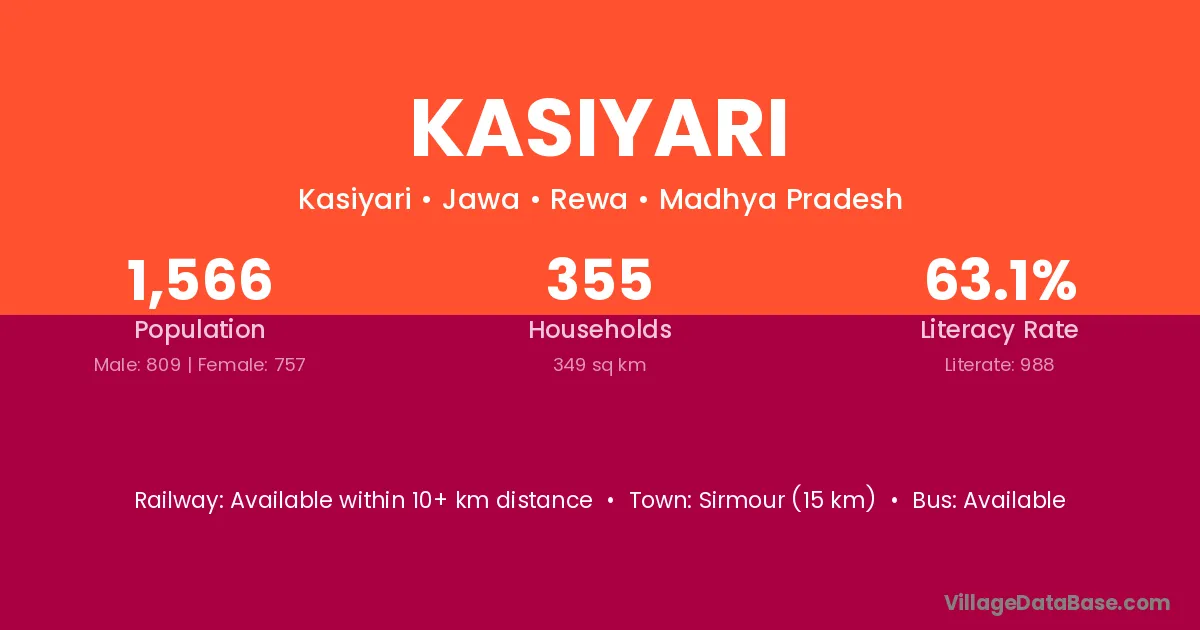 Sirmour (15 km) is the nearest town to Kasiyari village for major economic activities and is located approximately 15 km away.
