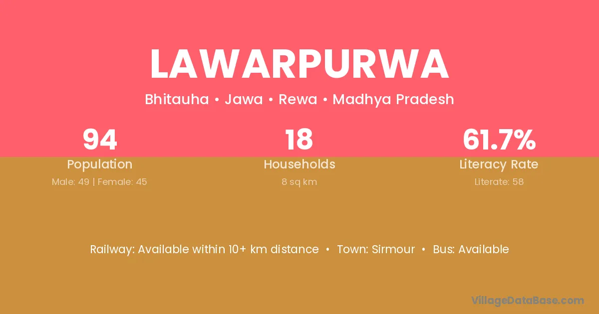 Lawarpurwa village has a total population of 94 people, of which 49 are males and 45 are females.