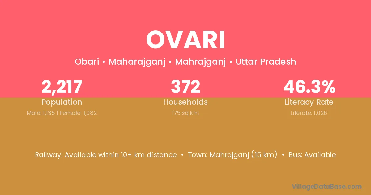 The literacy rate of Ovari village is 45.10%. Male literacy stands at 57.51% and female literacy at 30.49%.