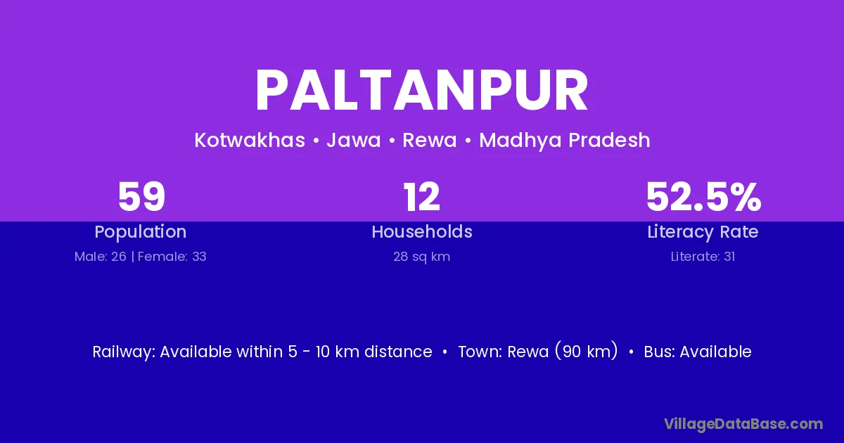 Rewa (90 km) is the nearest town to Paltanpur village for major economic activities and is located approximately 90 km away.