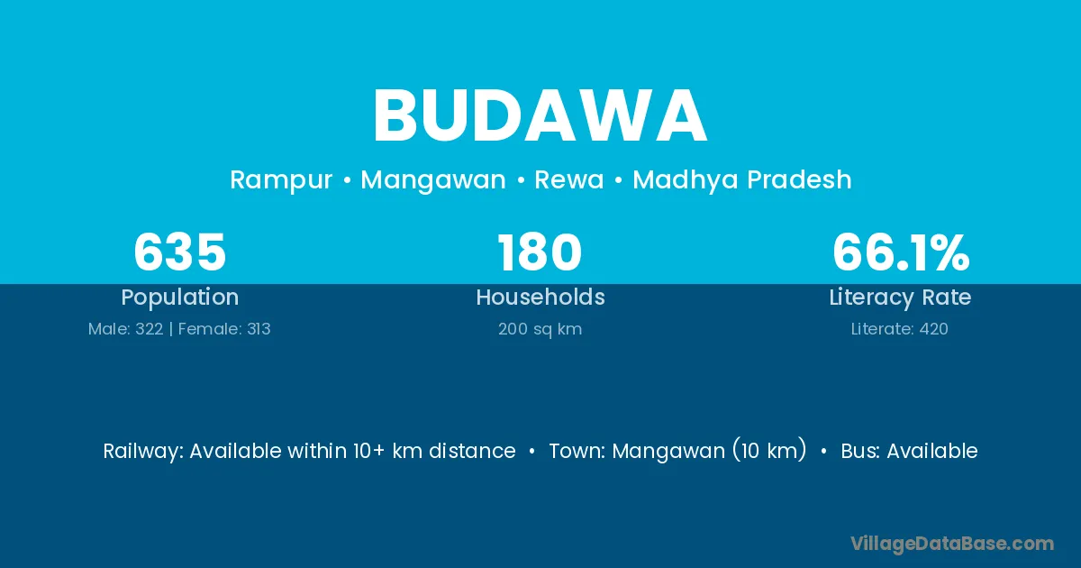 Budawa village has a total population of 635 people, of which 322 are males and 313 are females.
