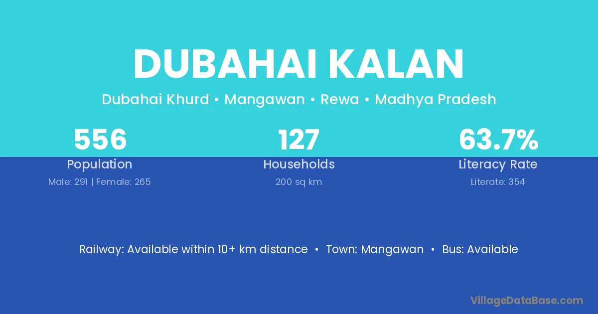 Dubahai Kalan village has a total population of 556 people, of which 291 are males and 265 are females.