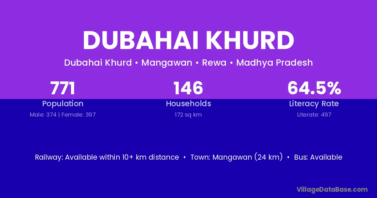 Dubahai Khurd village has a total population of 771 people, of which 374 are males and 397 are females.