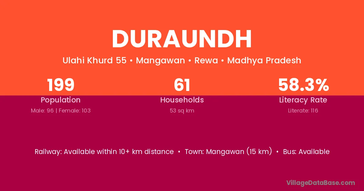 Mangawan (15 km) is the nearest town to Duraundh village for major economic activities and is located approximately 15 km away.