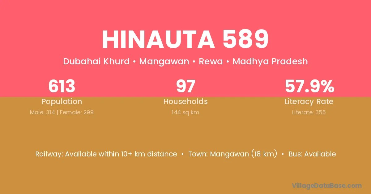 Mangawan (18 km) is the nearest town to Hinauta 589 village for major economic activities and is located approximately 18 km away.