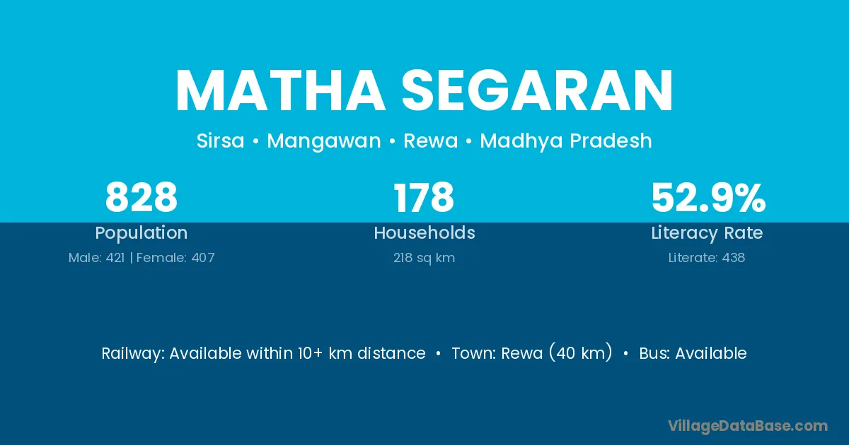 Rewa (40 km) is the nearest town to Matha Segaran village for major economic activities and is located approximately 40 km away.
