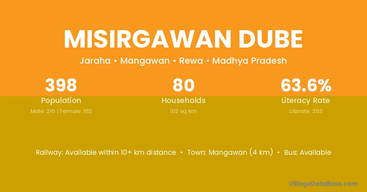 Misirgawan Dube village has a total population of 398 people, of which 216 are males and 182 are females.