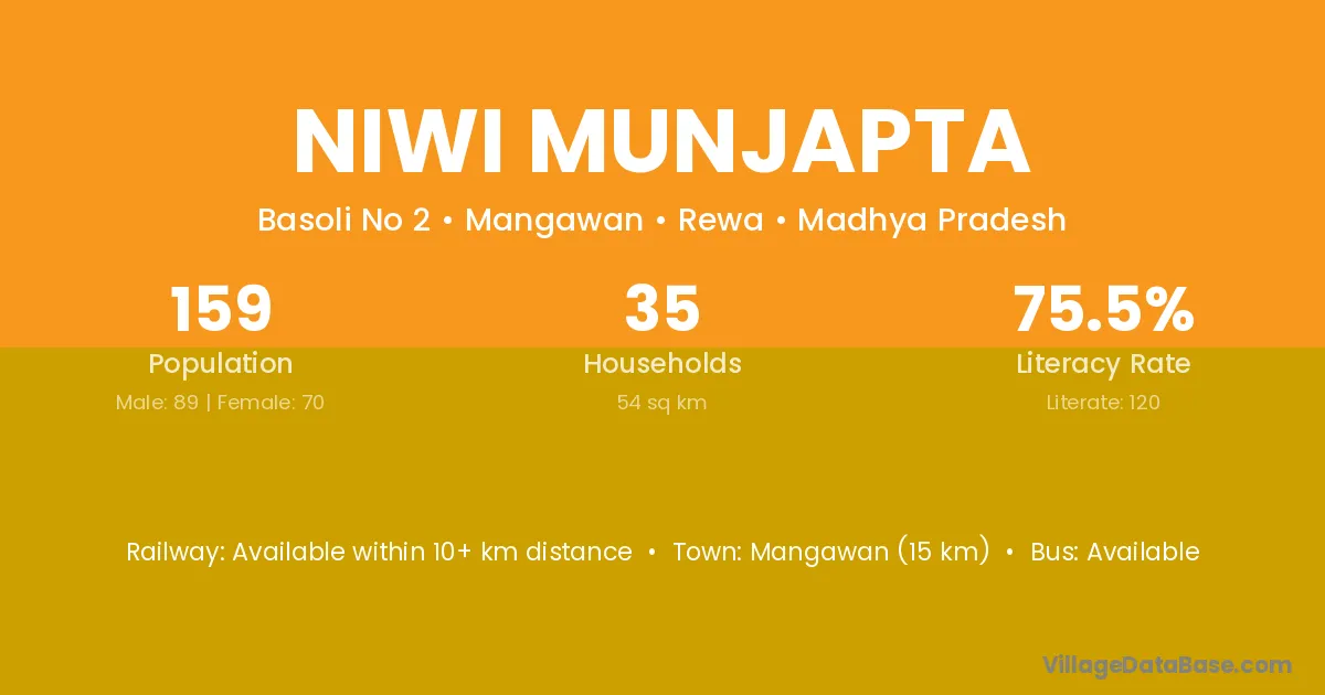Mangawan (15 km) is the nearest town to Niwi Munjapta village for major economic activities and is located approximately 15 km away.