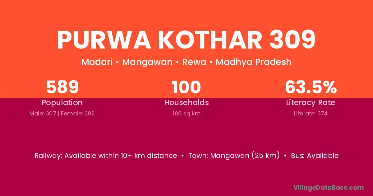 Purwa Kothar 309 village has a total population of 589 people, of which 307 are males and 282 are females.