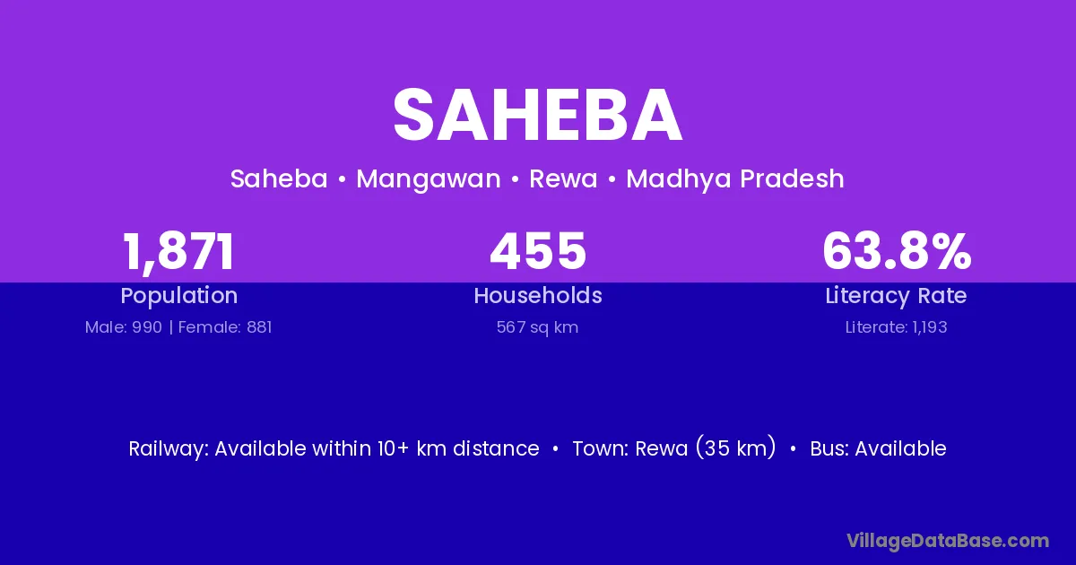 Rewa (35 km) is the nearest town to Saheba village for major economic activities and is located approximately 35 km away.