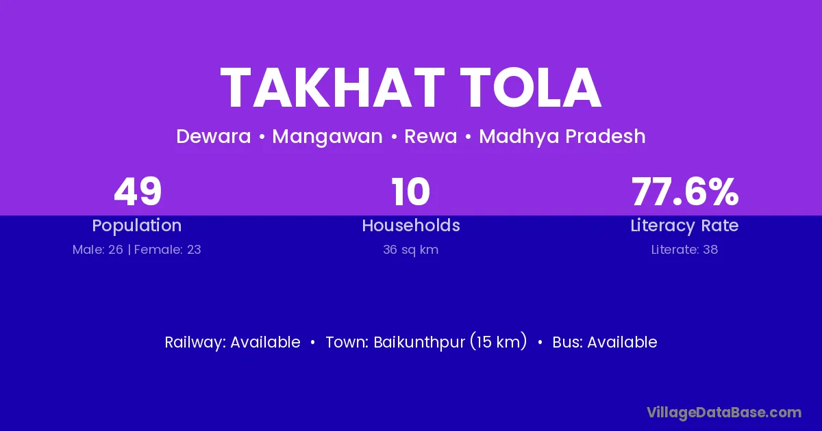 Baikunthpur (15 km) is the nearest town to Takhat Tola village for major economic activities and is located approximately 15 km away.