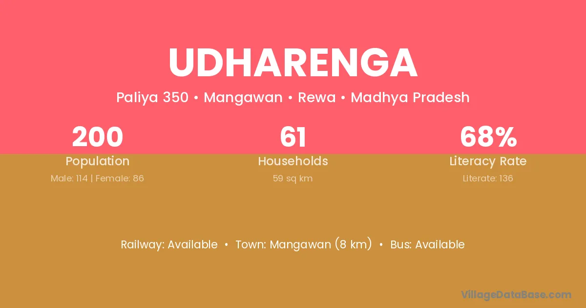 Mangawan (8 km) is the nearest town to Udharenga village for major economic activities and is located approximately 8 km away.