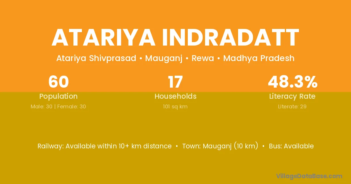 Atariya Indradatt village has a total population of 60 people, of which 30 are males and 30 are females.