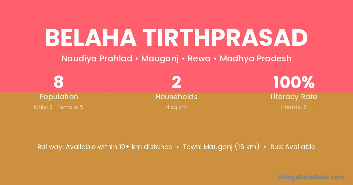 Mauganj (16 km) is the nearest town to Belaha Tirthprasad village for major economic activities and is located approximately 16 km away.