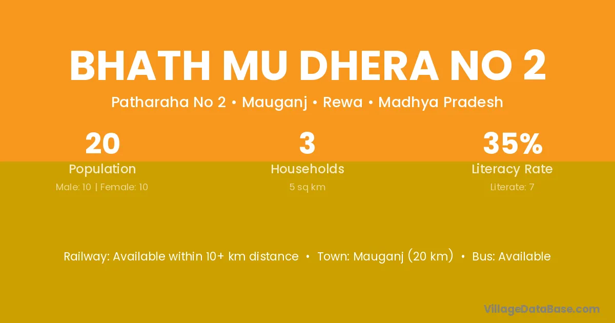 Mauganj (20 km) is the nearest town to Bhath Mu Dhera No 2 village for major economic activities and is located approximately 20 km away.
