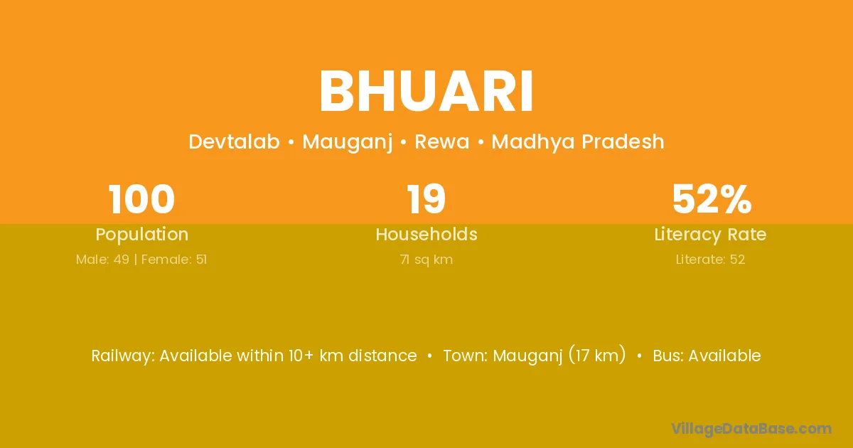 Mauganj (17 km) is the nearest town to Bhuari village for major economic activities and is located approximately 17 km away.