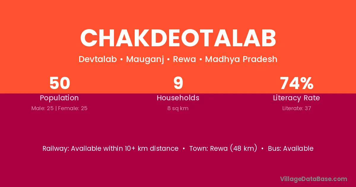 Rewa (48 km) is the nearest town to Chakdeotalab village for major economic activities and is located approximately 48 km away.
