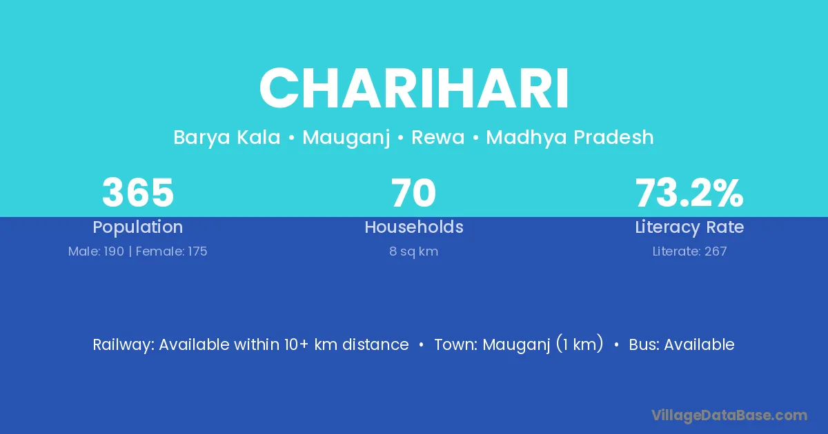 Mauganj (1 km) is the nearest town to Charihari village for major economic activities and is located approximately 1 km away.