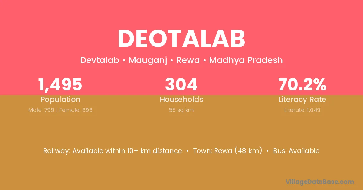 Rewa (48 km) is the nearest town to Deotalab village for major economic activities and is located approximately 48 km away.