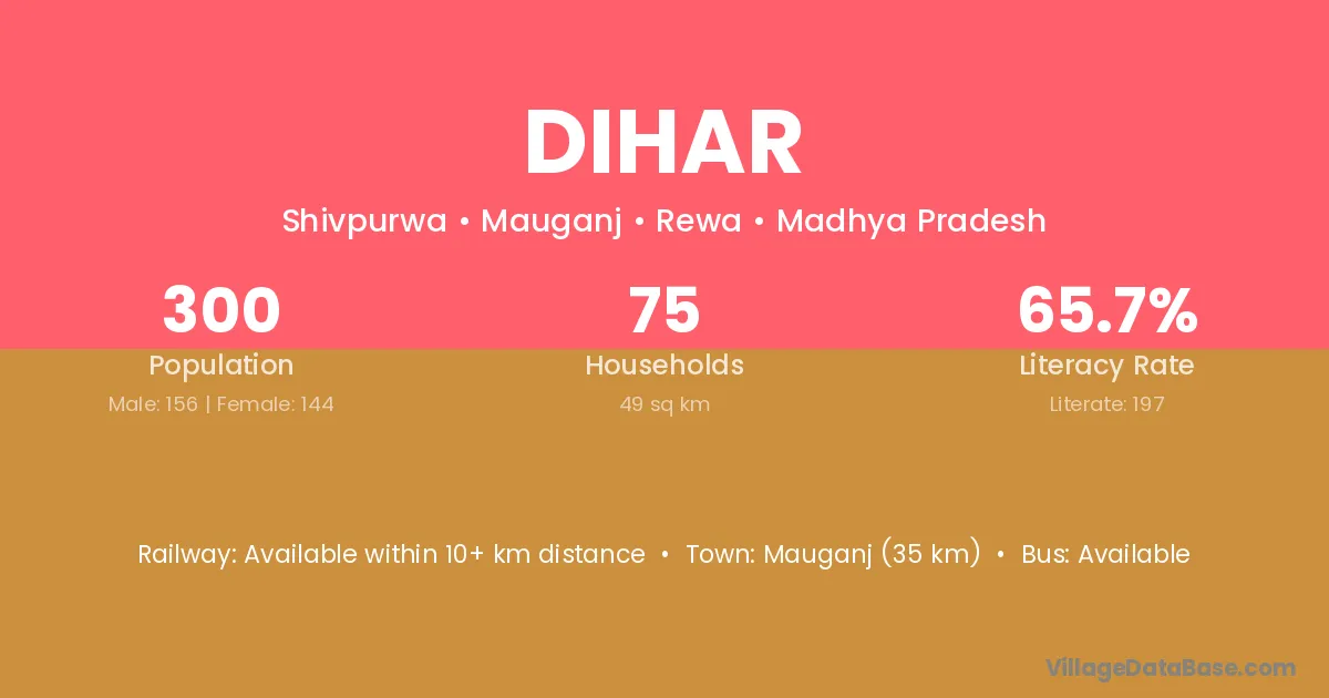 Mauganj (35 km) is the nearest town to Dihar village for major economic activities and is located approximately 35 km away.