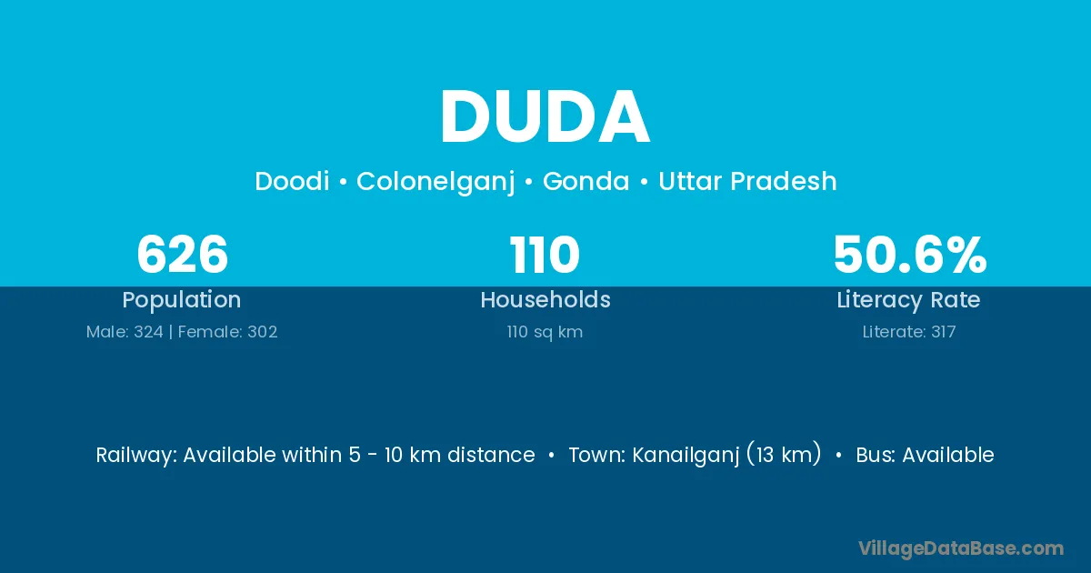 Rewa (50 km) is the nearest town to Duda village for major economic activities and is located approximately 50 km away.