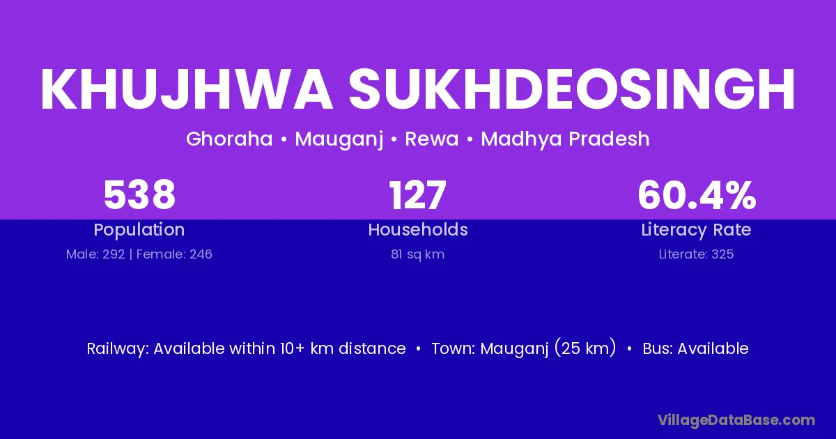 Mauganj (25 km) is the nearest town to Khujhwa Sukhdeosingh village for major economic activities and is located approximately 25 km away.