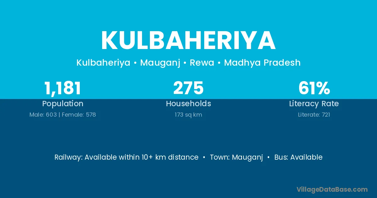 Kulbaheriya village has a total population of 1,181 people, of which 603 are males and 578 are females.