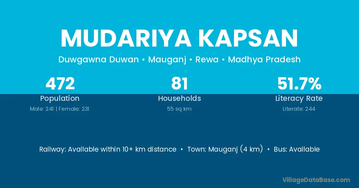 Mauganj (4 km) is the nearest town to Mudariya Kapsan village for major economic activities and is located approximately 4 km away.