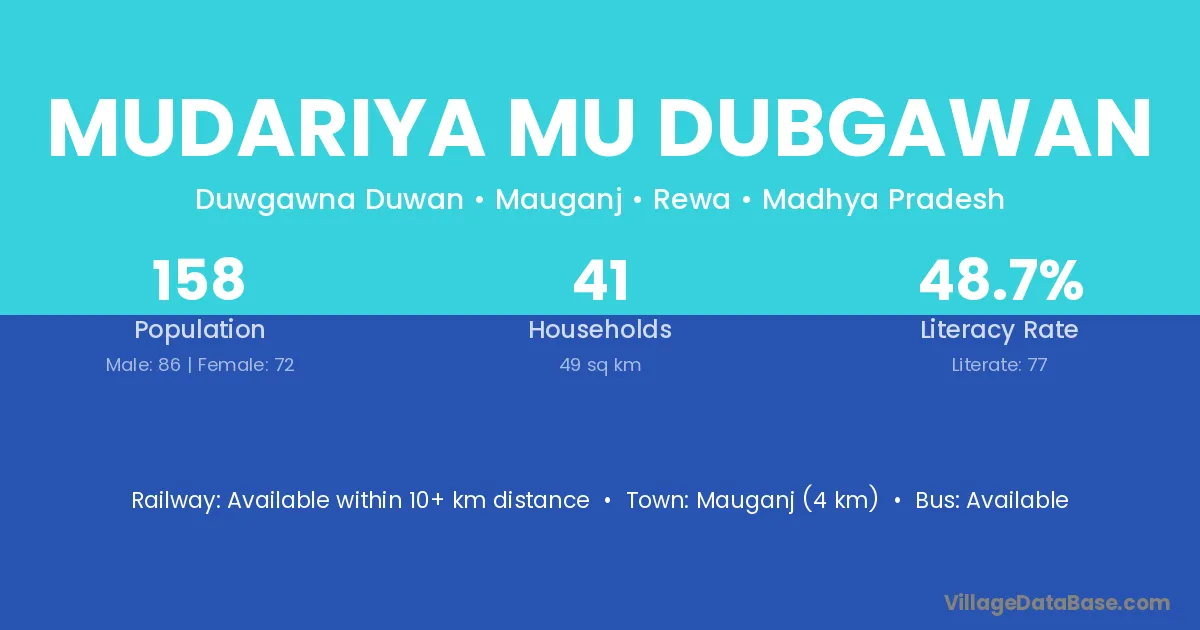 Mauganj (4 km) is the nearest town to Mudariya Mu Dubgawan village for major economic activities and is located approximately 4 km away.