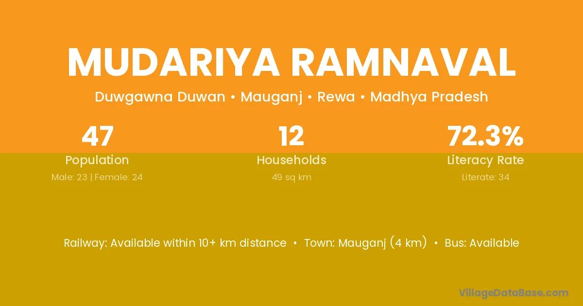 Mudariya Ramnaval village has a total population of 47 people, of which 23 are males and 24 are females.