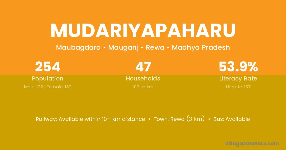 Rewa (3 km) is the nearest town to Mudariyapaharu village for major economic activities and is located approximately 3 km away.