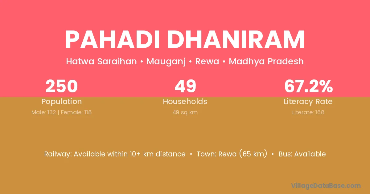 Rewa (65 km) is the nearest town to Pahadi Dhaniram village for major economic activities and is located approximately 65 km away.