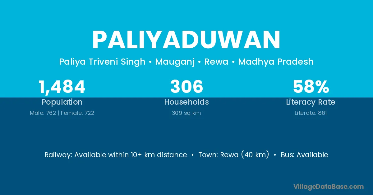 Rewa (40 km) is the nearest town to Paliyaduwan village for major economic activities and is located approximately 40 km away.