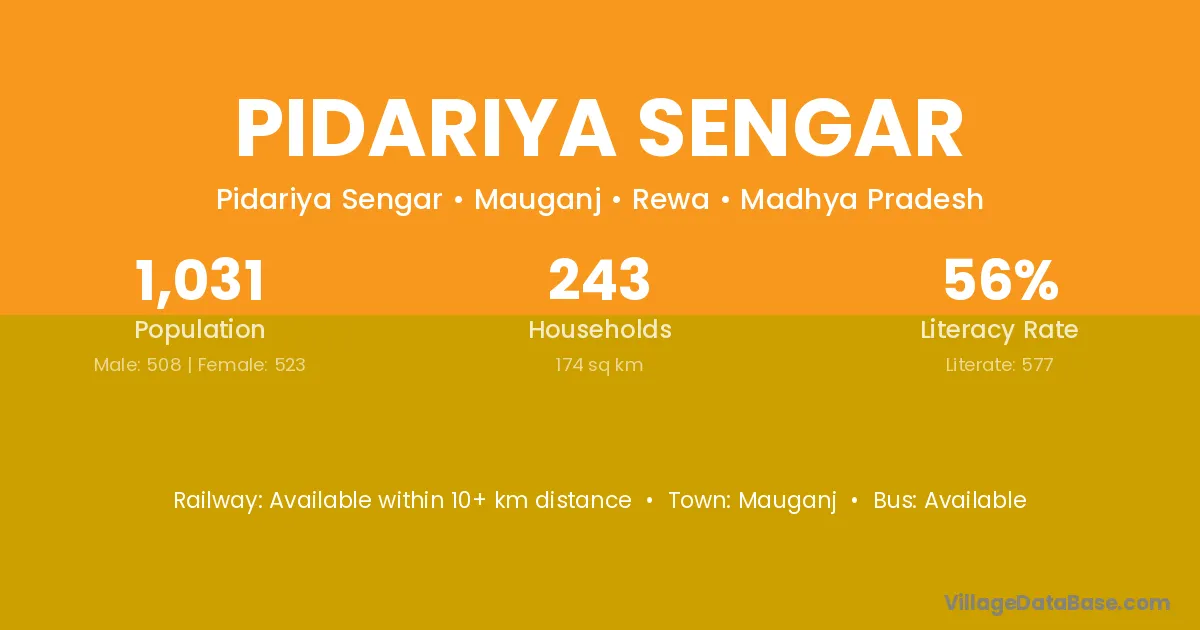 Pidariya Sengar village has a total population of 1,031 people, of which 508 are males and 523 are females.