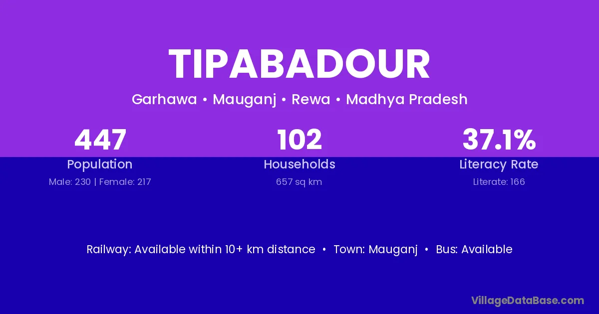 Tipabadour village has a total population of 447 people, of which 230 are males and 217 are females.