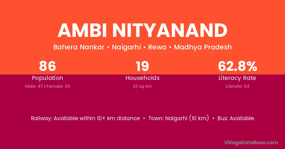 Ambi Nityanand village has a total population of 86 people, of which 47 are males and 39 are females.