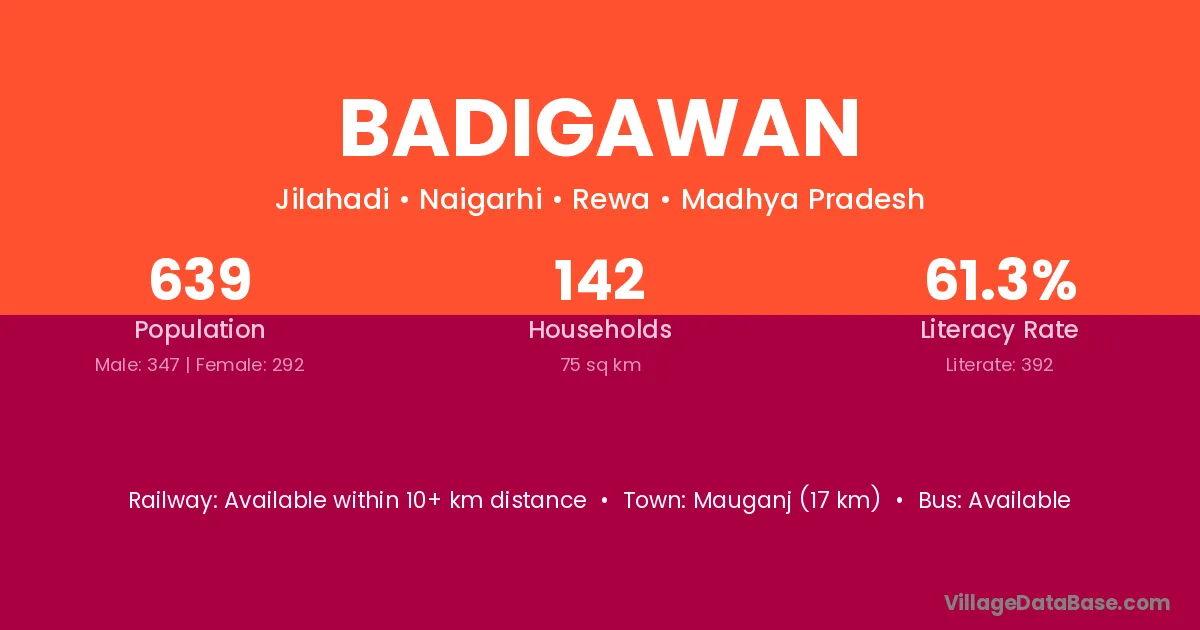 Mauganj (17 km) is the nearest town to Badigawan village for major economic activities and is located approximately 17 km away.